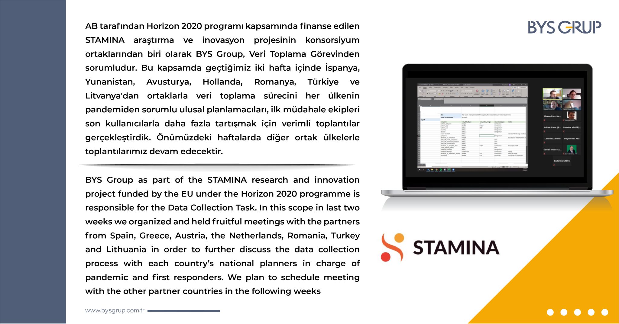 BYSMUNICH as part of the STAMINA research and innovation project funded by the EU under the Horizon 2020 programme is responsible for the Data Collection Task. In this scope in last two weeks we organized and held fruitful meetings with the partners from Spain, Greece, Austria, the Netherlands, Romania, Turkey and Lithuania in order to further discuss the data collection process with each country’s national planners in charge of pandemic and first responders. We plan to schedule meeting with the other partner countries in the following weeks.